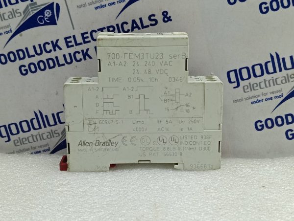 Product: Multi-Function General Purpose Time Relay Model No: 700-Fem3tu23 Series: B A1-A2: 24-240 Vac 24-48 Vdc Time: 0.05s-10h Uimp: 4000v Ith: 5a Ue: 250v Ac14 Ie 1a Make: Allen-Bradley Made: Switzerland Condition: Used
