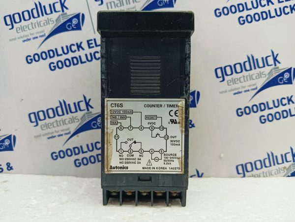 Product: Counter/Timer Model No: Ct6s 12vdc 100ma Out: 30vdc 100ma No: 250vac 3a Nc: 250vac 2a Source: 100-240vac 50/60hz 5.2va Make: Autonics Made: Korea Condition: Used