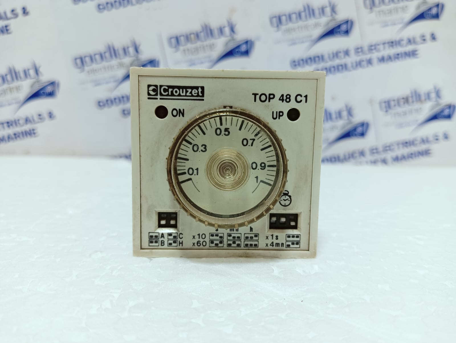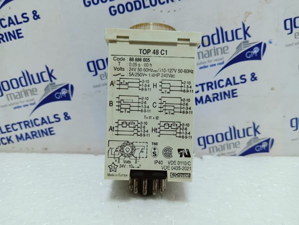 Product: Timer Model No: Top 48 C1 T: 0,05s – 60h Volts: 24v 50-60hz 110-127v 50-60hz 5a/250v~ 1/4hp 240vac Protection: Ip40 Make: Crouzet Made: Europe Condition: Used