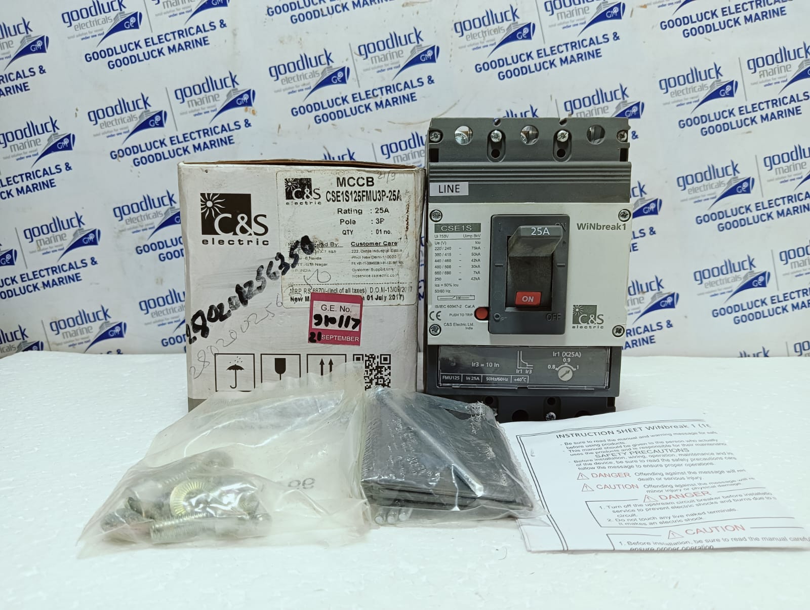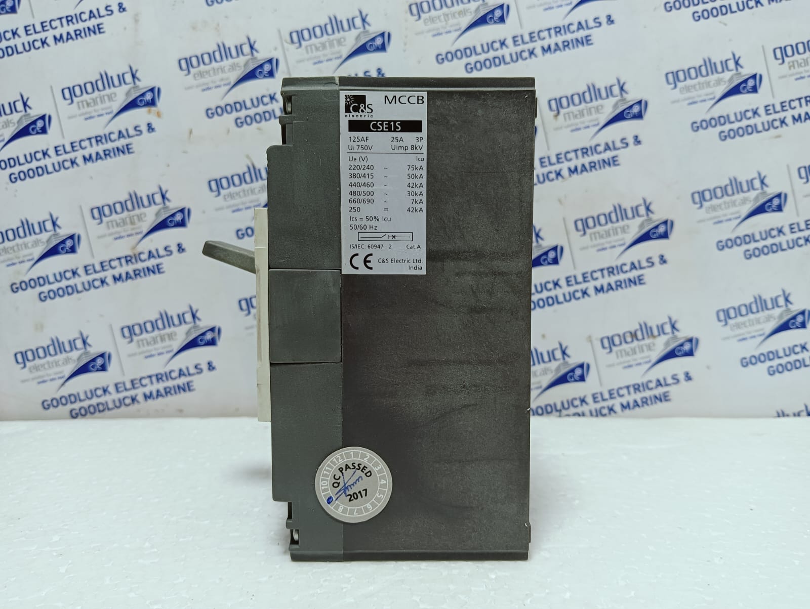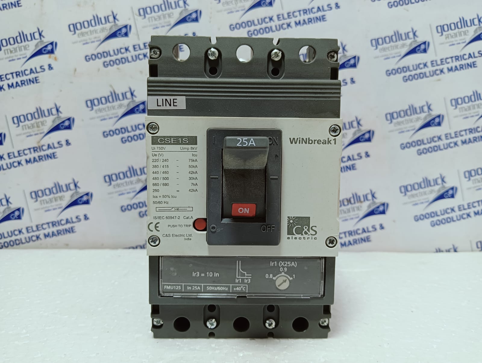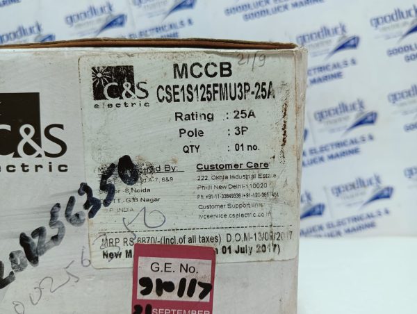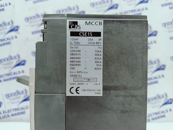 Product: Mccb Model No: CSE1S Cse1s125fmu3p-25a Ampere: 25a Poles: 3 Poles Ui: 750v Uimp: 8kv Ue(V): 220 – 690v~ Icu: 7 – 75ka Ics: 50% Icu 50/60hz Cat. A Make: C&S Electric Made: India Condition: New