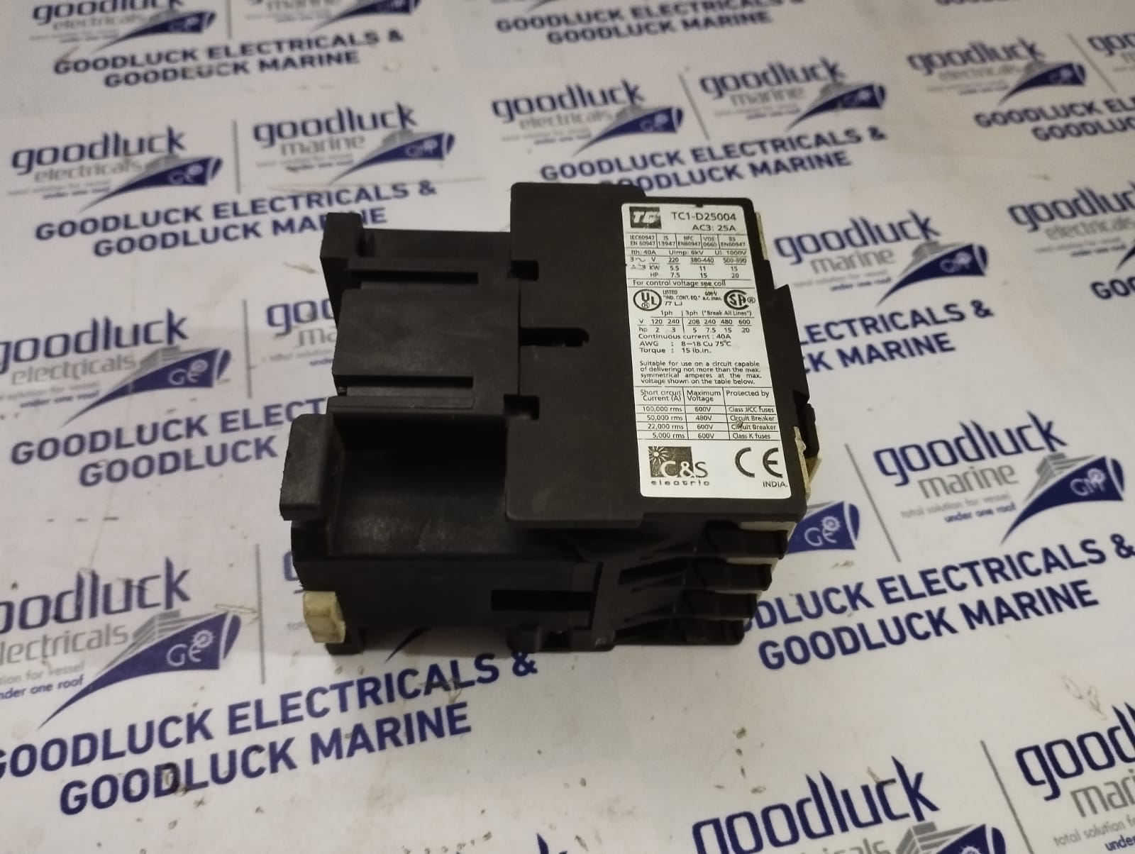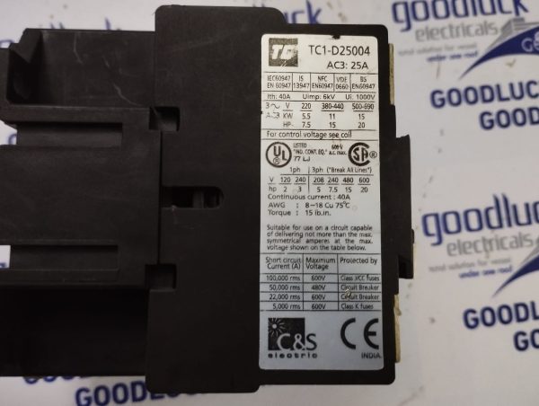 Product: Contactor Model No: Tc1-D25004 Ith: 40a Uimp: 6kv Ui: 1000v 3~ V 220 380-440 500-690 Ac3 Kw 5.5 11 15 Hp 7.5 15 20 Awg: 8-18cu 75°C Torque: 15lb.In Make: C&S Electric Made: India Condition: Used