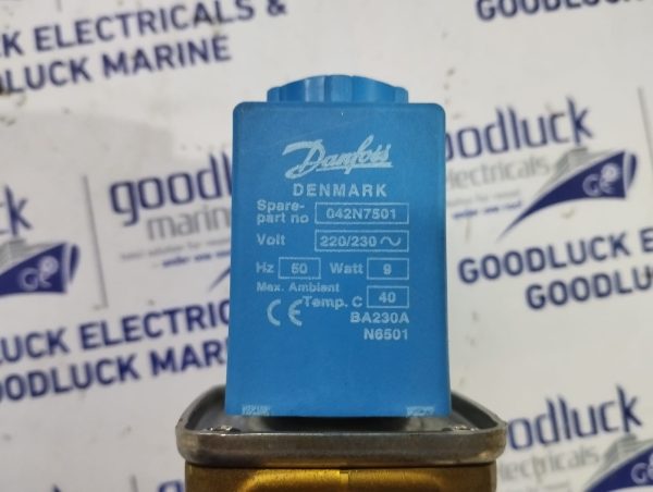 Product: Solenoid Coil Model No: 042n7501 Volt: 220/230~ Hz: 50hz Watt: 9w Max. Ambient: 40°C Make: Danfoss Made: Denmark Condition: Used