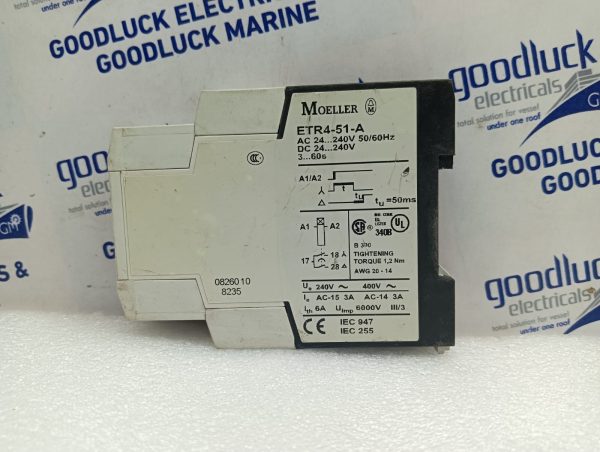 Product: Timing Relay Model No: Etr4-51-A Ac 24-240v 50/60hz Dc 24-240v 3-60s Tu: 50ms Ue: 240v~ 400v~ Ie Ac-15: 3a Ac-14: 3a Ith: 6a Uimp: 6000v Make: Moeller Condition: Used