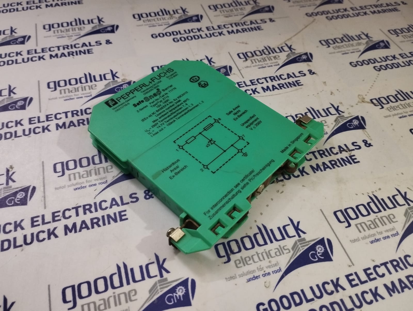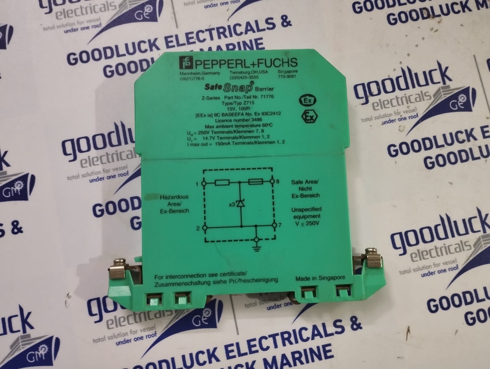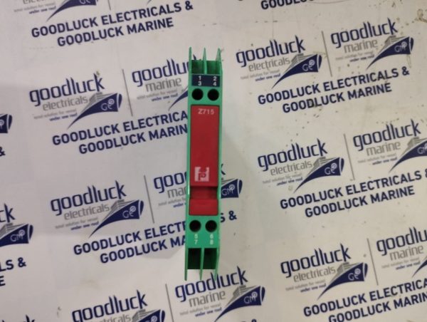 Product: Safe Snap Barrier Model No: Z715 Part No: 71776 15v , 100r Max.Ambient Temperature: 60°C Um: 250v Terminals 7,8 Uz: 14.7v Terminals 1,2 I Max Out: 150ma Terminals 1,2 Make: Pepperl+Fuchs Made: Singapore Condition: Used