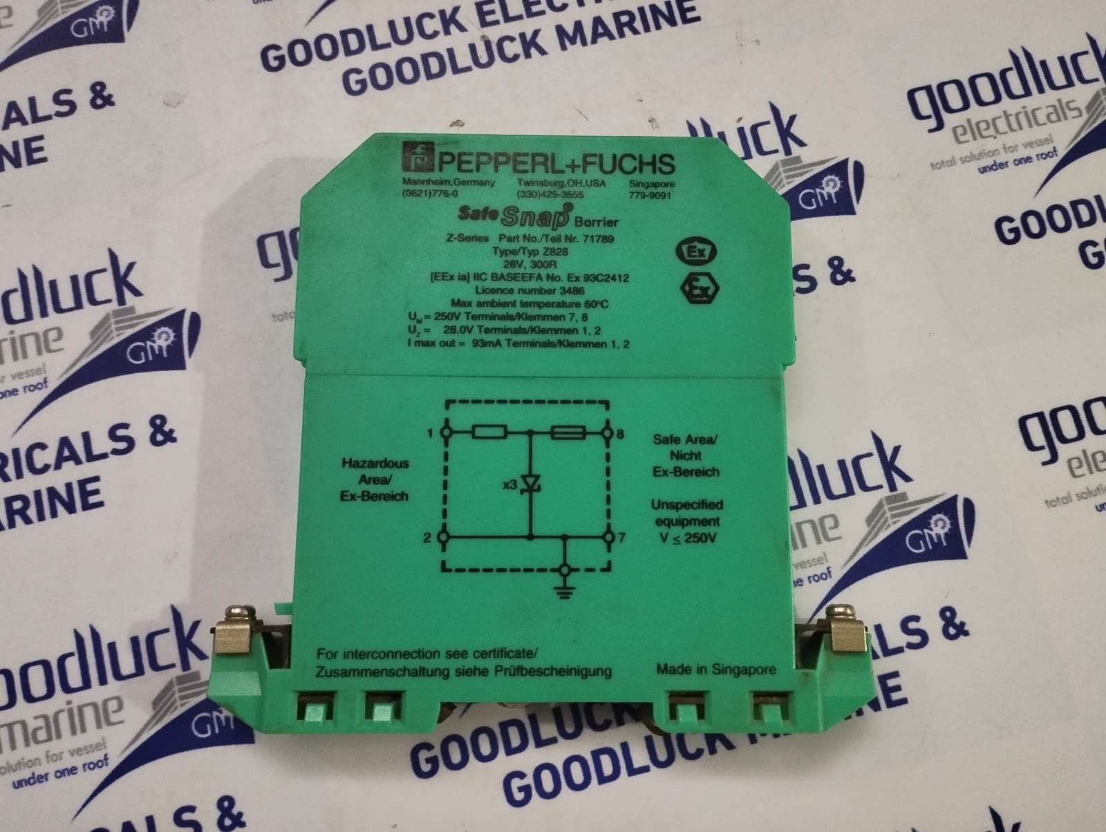 Product: Safe Snap Barrier Model No: Z828 Part No: 71789 28v , 300r Max.Ambient Temperature: 60°C Um: 250v Terminals 7,8 Uz: 28.0v Terminals 1,2 I Max Out: 93ma Terminals 1,2 Make: Pepperl+Fuchs Made: Singapore Condition: Used