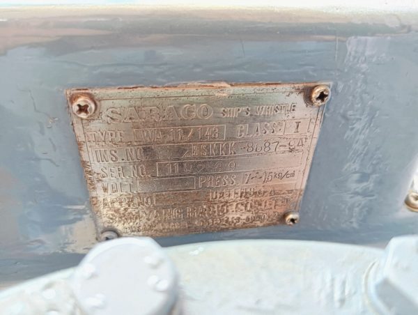 Product: Ship Whistle Type: Wa-11/143 Ins. No: Bsnkk-8687-94 Ser. No: 1102-39 Press.: 7~15 Kg/Cm² Make: Saraco