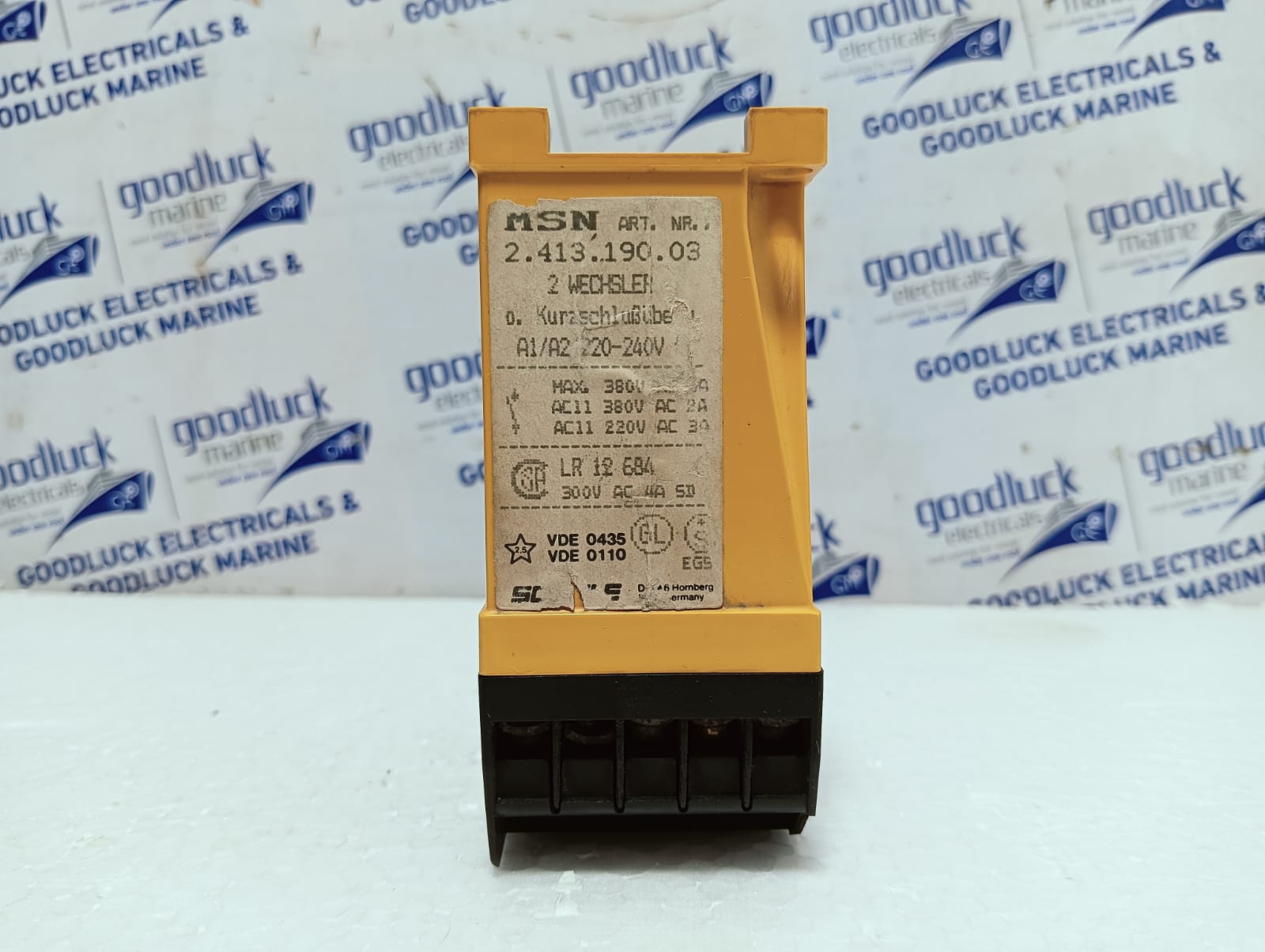 Product: Time Relay Model No: MSN Art. No: 2.413.190.03 A1/A2: 220 – 240v Max. 380v Ac 5a Ac11 380v Ac 2a Ac11 220v Ac 3a Lr 12 684 300v Ac 4a 5d Make: Schiele Made: Germany Condition: Used