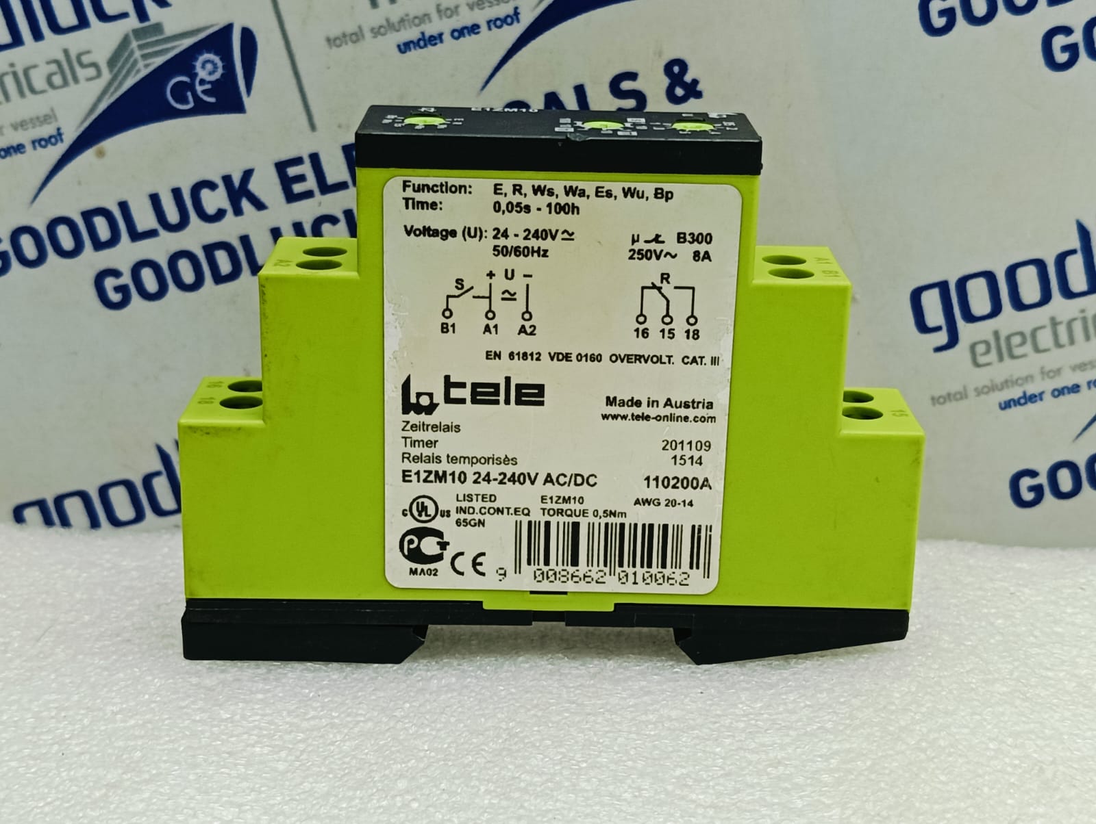 Product: Multifunction Timer Model No: E1zm10 Function: E, R, Ws, Es, Wu, Bp Time: 0,05s – 100h Voltage(U): 24 – 240v~ 50/60hz U B300 250v~ 8a E1zm10 24-240v Ac/Dc Make: Tele Made: Austria Condition: Used