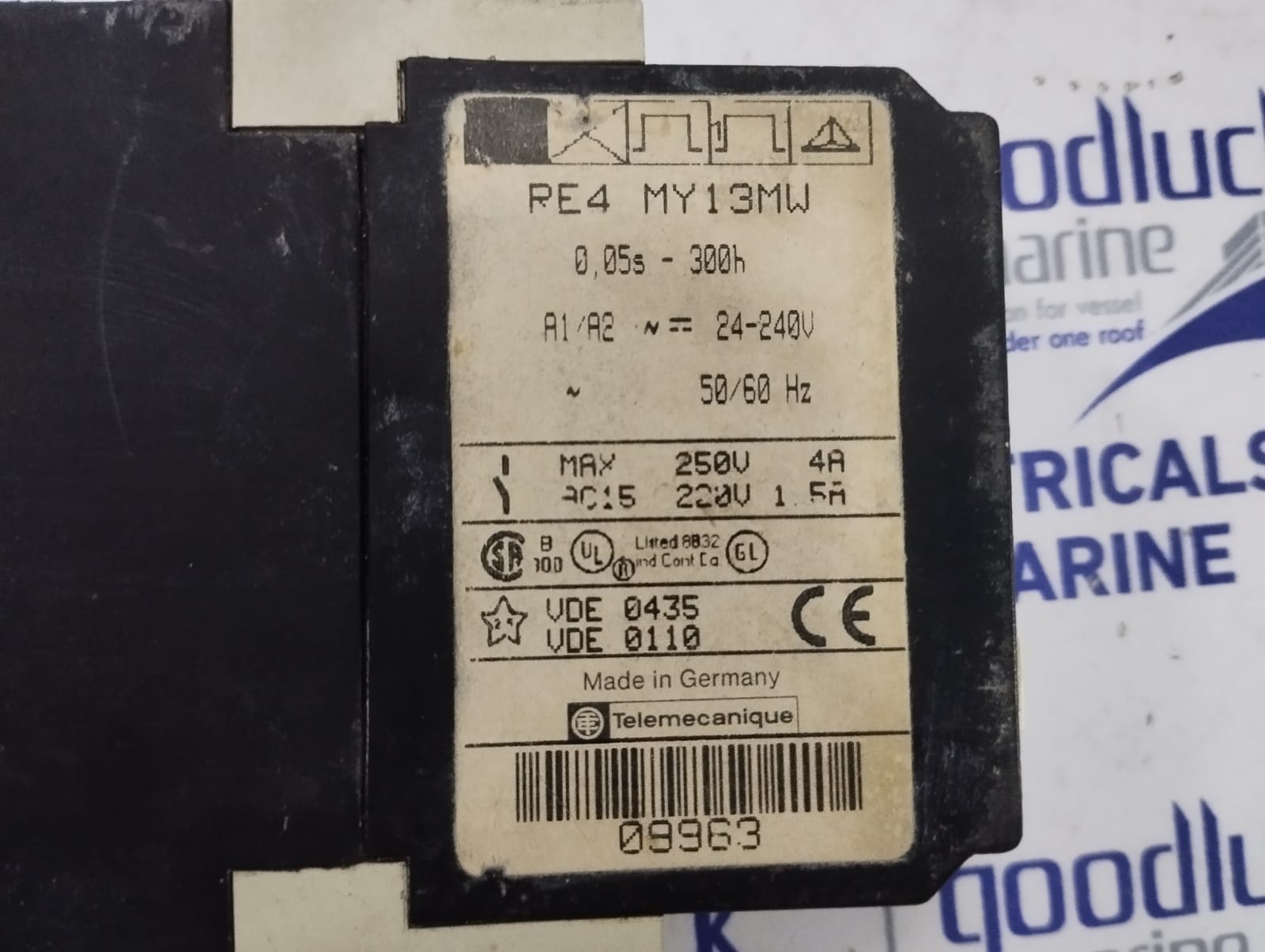Product: Time Delay Relay Model No: Re4 My13mw 0.05s-300h A1/A2: 24-240v 50-60hz Max. 250v 4a Ac15: 220v 1 5a Make: Telemecanique Made: Germany Condition: Used